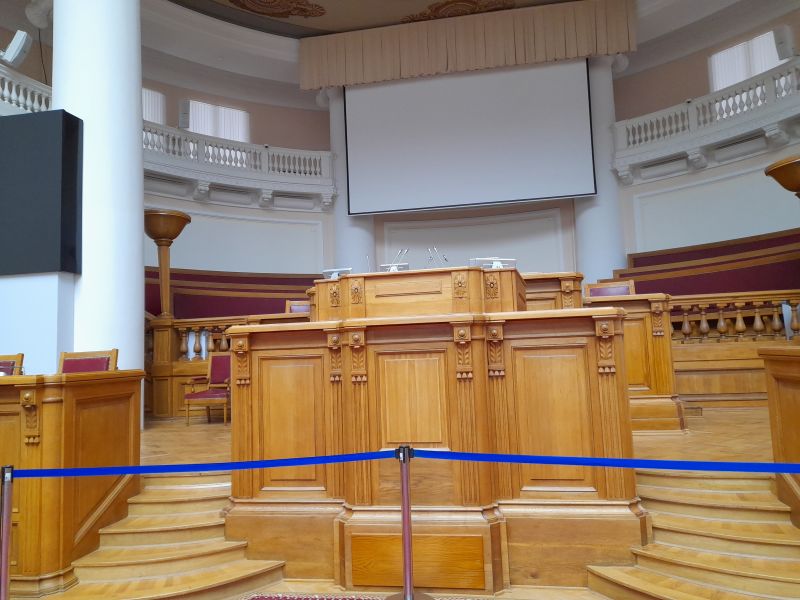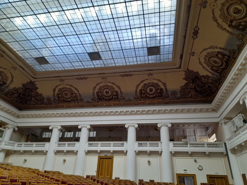 Войдём в Думский зал. Световой фонарь сделан в 1910 году Бруни. Здесь заседала Государственная Дума с 1906 по 1917 годы. На балконе присутствовала публика (желающие).