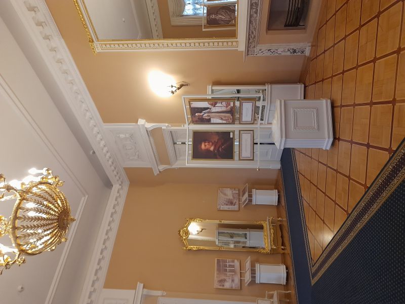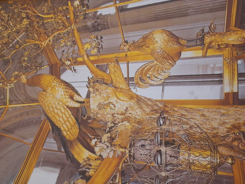 Перед нами Бежевая гостиная. Здесь много лет стояли знаменитые часы Павлин, создатель – Джеймс Кокс. В 1781 году часы прибыли в Петербург. После смерит князя часы были доставлены в Эрмитаж в 1797 году.