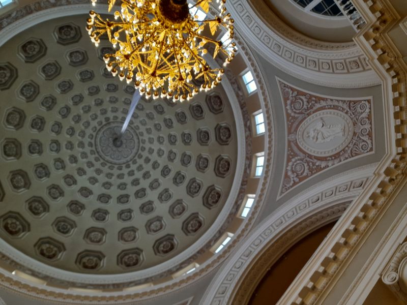 Далее пройдём в Парадные залы: Купольный зал, Большая галерея, Зимний сад. Они расположены перпендикулярно от входа. Была перспектива бесконечности, впереди видели небо. Перед нами Купольный зал. Интерьеры тут XIX века. Росписи – обращение к Элиаде. На потолке купола нет, он расписан в технике грязаль: 3D иллюзия, что купол есть. В этом зале звучал орган.