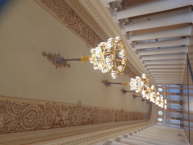Перед нами Большая галерея. Стены не было, за стеной был Зимний сад. Интерьеры также XIX века. 36 колонн. Люстры прибыли из Зимнего дворца в XIX веке. Это была беседка, предваряющая Зимний сад. Здесь произошёл знаменитый Бал в 1791 году. Его осветил Гавриил Державин. На гостях было много бриллиантов. Екатерина II была главным гостем. Здесь же состоялась последняя публичная встреча её с Потёмкиным. Также гостем был ненаследный принц Персии, от имени деда он просил прощения за разгром Посольства в Тегеране и убийство Грибоедова.
