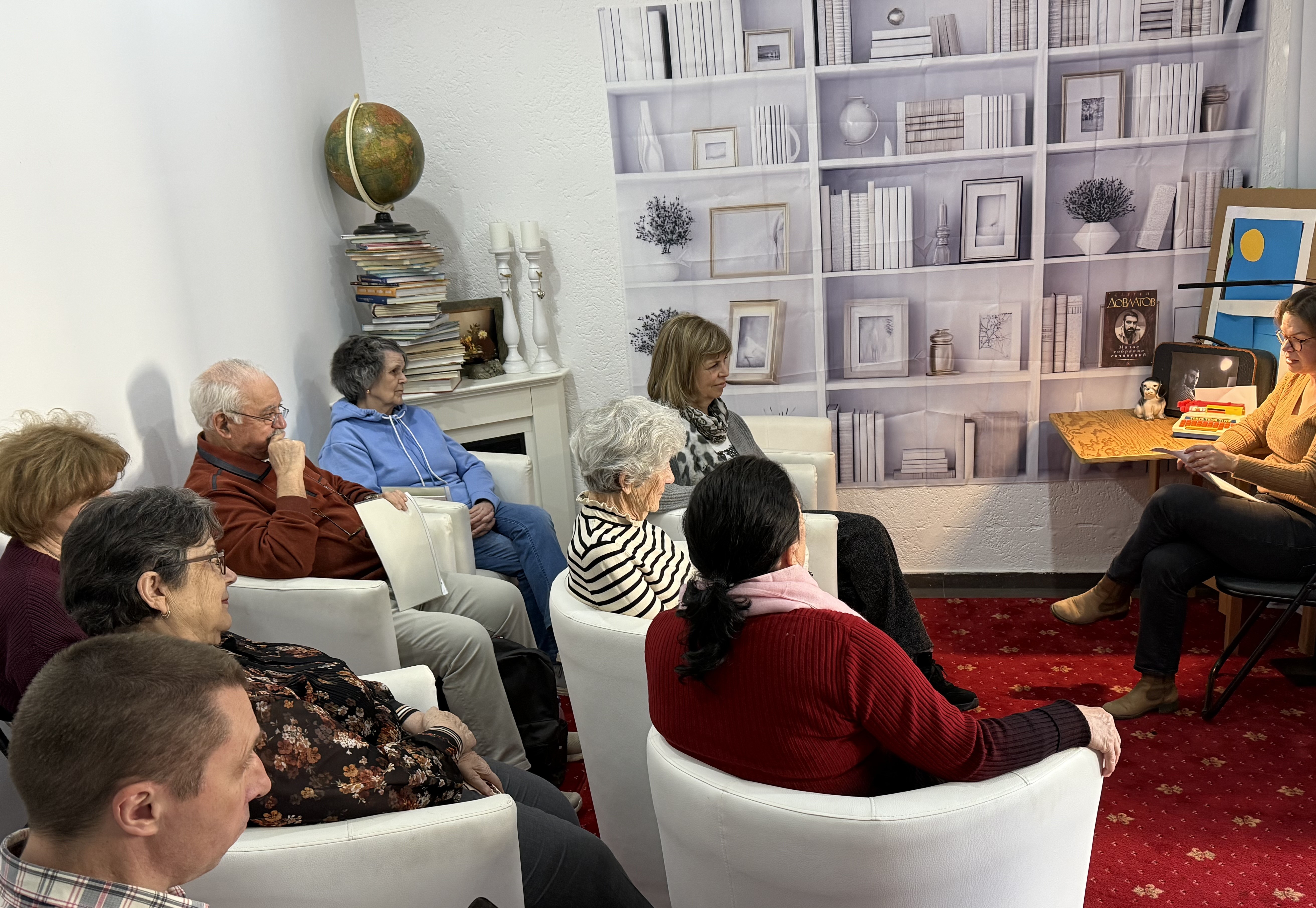 Тема встречи так и называлась: «Страничка у Довлатова». Послушать отрывки из произведений писателя., которые читали собравшиеся, оказалось очень интерсной организационной находкой. Выбранные отрывки увлекали слушателей разнообразностью направлений. И это отражалось на смене настроя слушателей, заставляло вновь переосмысливать часто знакомые уже строки, узнавать новые, ещё не читанные у этого автора.