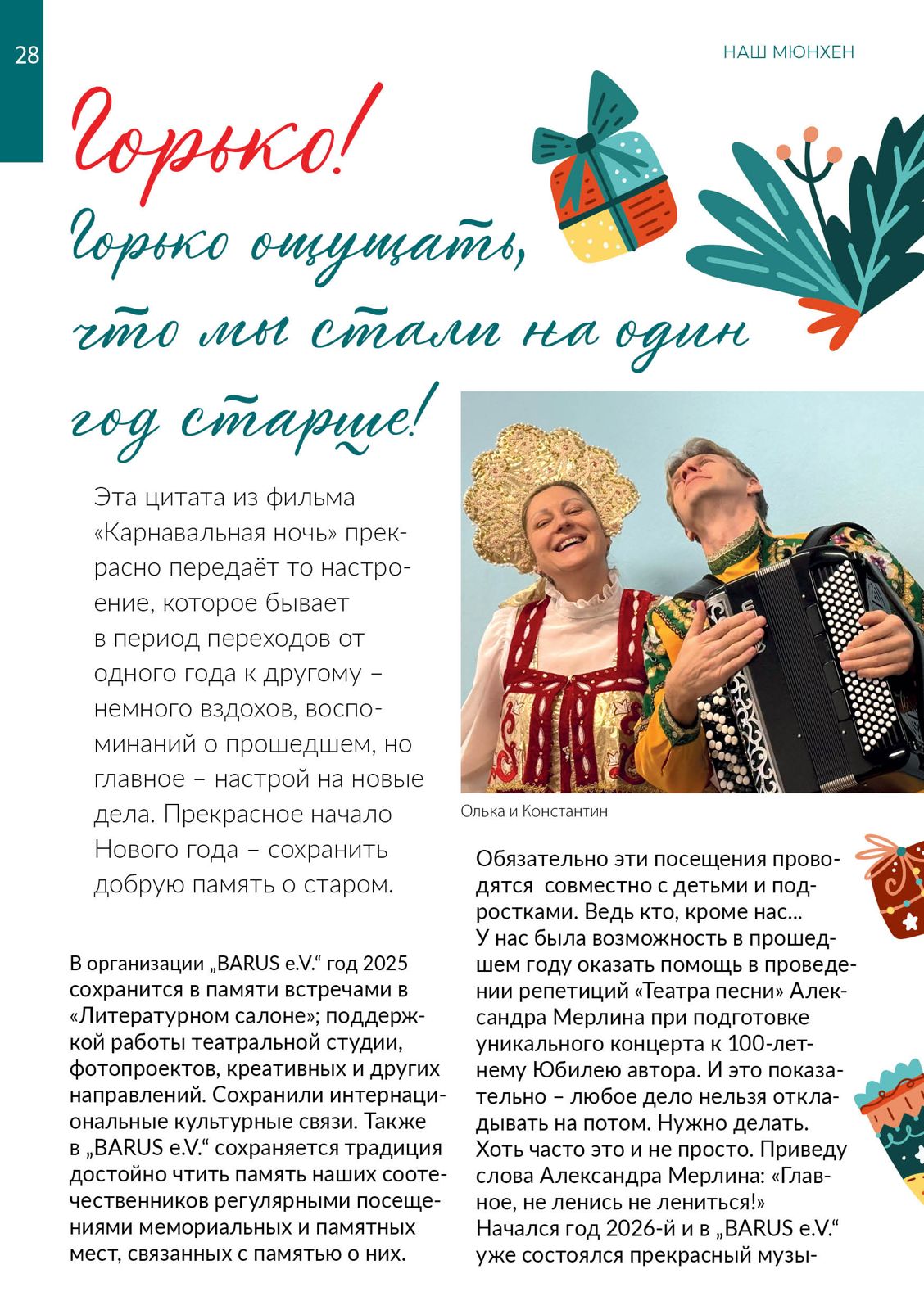 Начался год 2026-й и в „BARUS e.V.“ уже состоялся прекрасный музыкальный вечер «Душа поёт», украшением которого стали прекрасные артисты, профессионалы своего дела – певица Ольга и баянист Константин.