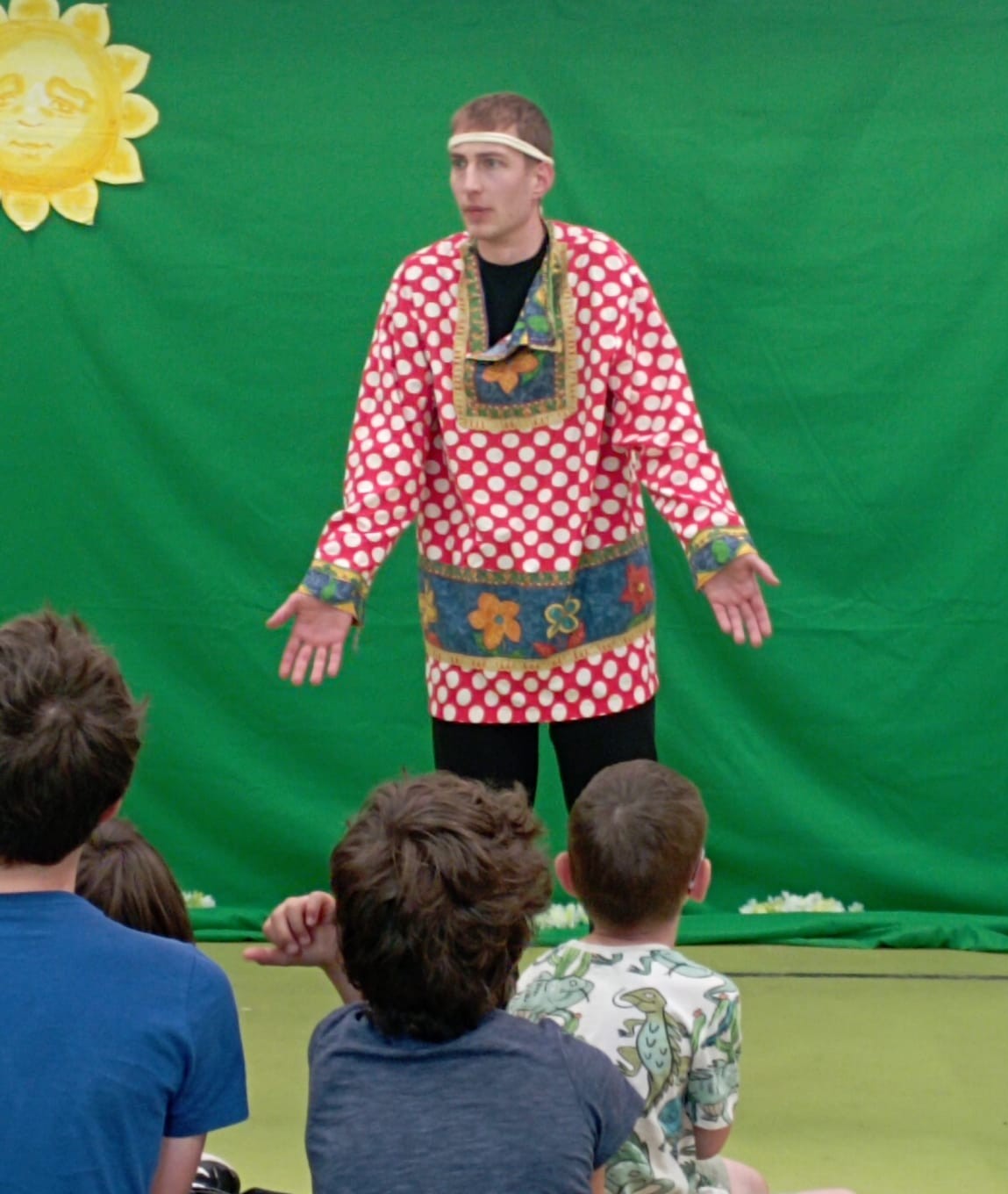 Начались репетиции, поиски каких-то характерных черт каждой роли. Наша Баба-Яга, благодаря идее сделать на голову венок из полевых трав, получилась весьма самобытной. Царь решил говорить со своеобразной хрипотцой и интонацией, это завораживало слушателей. Мы специально не смотрели никаких уже готовых постановок, которые мог нам предложить Интернет: не мы одни полюбили «Федота-стрельца». Но хотелось фантазировать самим. Так у нас получился сюжет, где рассказывалось, вернее, показывалось посредством пантомимы, искусство бродячих актёров, работающих в различных жанрах. Они и показали публике эту сказку. Пантомима помогла показать и ту часть сказки, которую пришлось сократить именно в текстовом её варианте. Конечно, у Леонида Филатова текст очень оригинален и интересен, но что поделаешь – даже с этим сокращением выступление длилось около полутора часов.