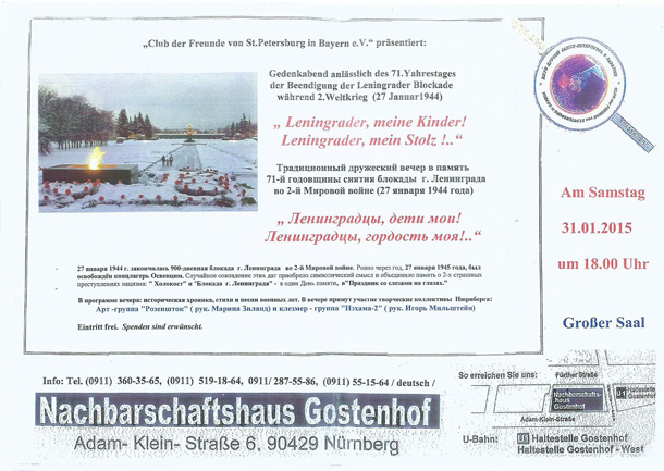 Вечер состоится в субботу, 31 января 2015 г., в 18 часов ( am Samstag, 31.Januar 2015, um 18-00 )
